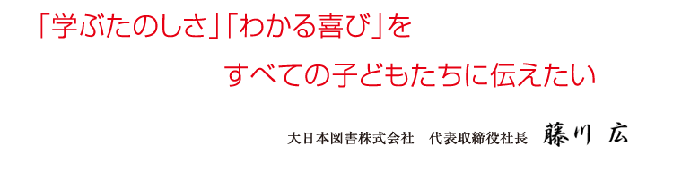 そのために「もっと輝く子どもたちの明日のために」という企業理念のもと、社員一同、豊かな感性と情熱をもって、著作者の方々など関係者のご協力をいただきながら、魅力あふれる出版活動を行います。そして、このたび策定したパーパス(すべての人の「知りたい」「たのしい」を、世界を変える力に育てる。)を実践し、教育・文化の大いなる発展に貢献して参ります。