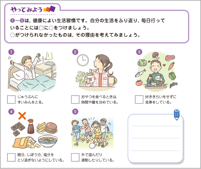 - 健康によい生活習慣を学習する際に,自分たちが日常摂っている食事についても考える場面を設定しています。