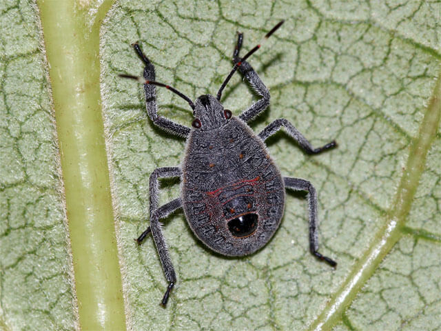 白っぽさは少なめですが、キマダラカメムシの幼虫らしい姿です。画像の幼虫は4齢ですが、2齢から終齢幼虫までほぼ似たような姿なので、こうなると何齢なのかわかりにくい昆虫です。キマダラカメムシは大型なので、4齢幼虫では体長が2cmほどになります。